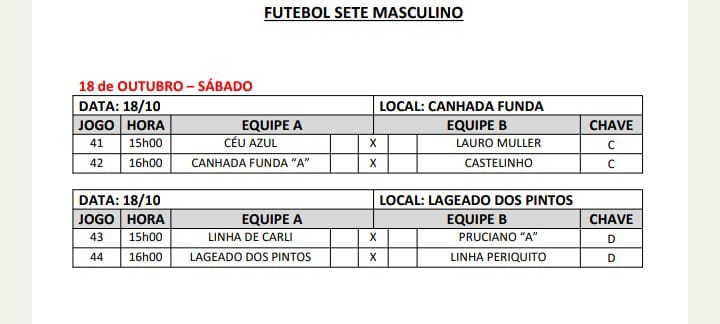 Pela Chave C a rodada acontece na comunidade de Canhada Funda e pela Chave D em Lageado dos Pintos.